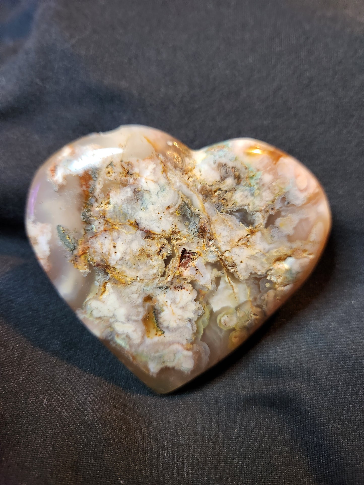 This flower agate heart carving is approximately 3" across and 2.5" top to bottom, it weighs 127.3 grams.